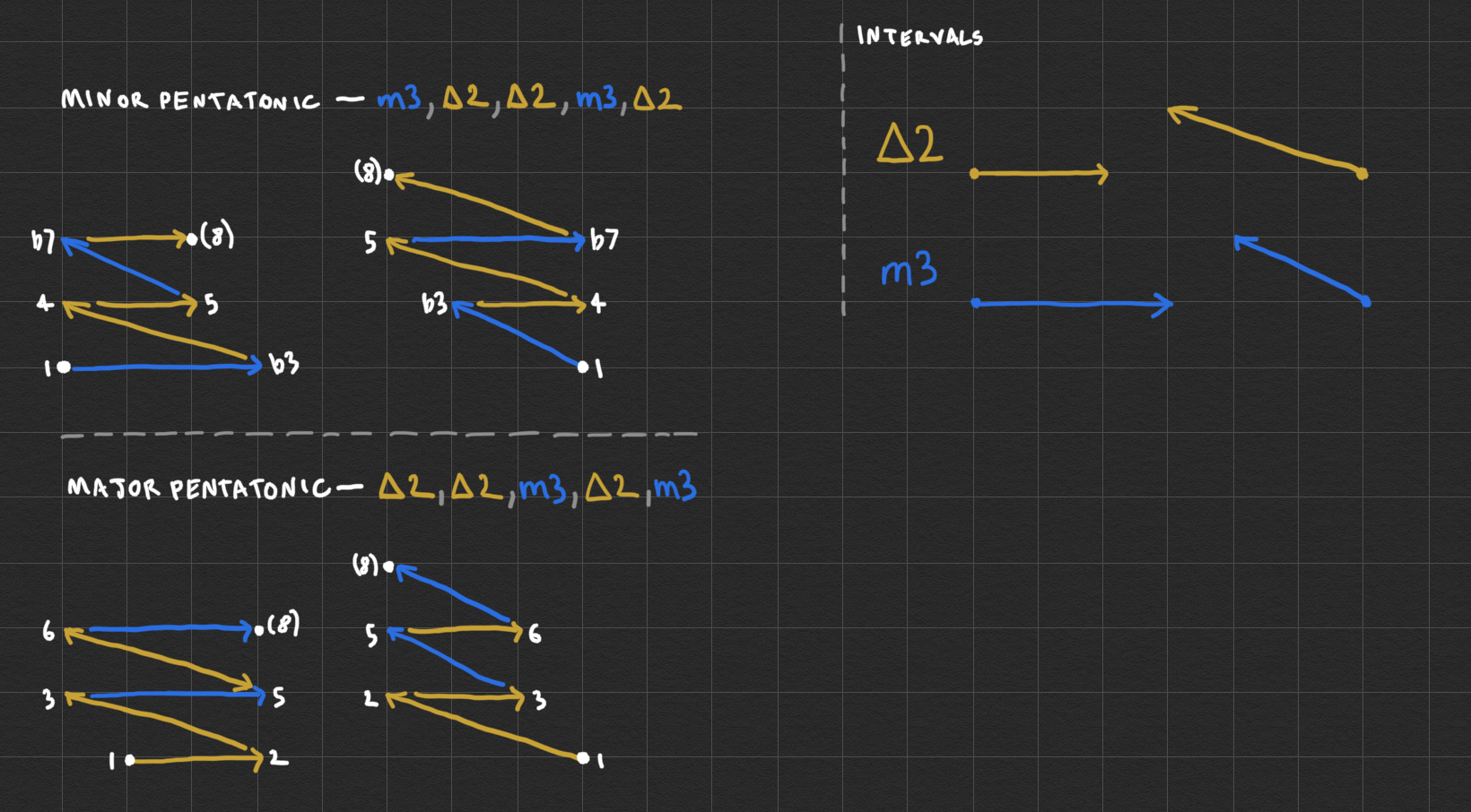 Since we're sharing... I started a project a while ago whose goal was to show how intervals could be visualized horizontally or vertically and then "stacked" or composed in different ways to create scales and chord shapes up and down the fretboard.